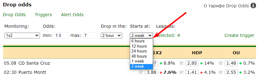 Начнем с описания возможностей по мониторингу движения коэффициентов в разделе DropOdds, разберемся для чего он нужен и какие функции выполняет.