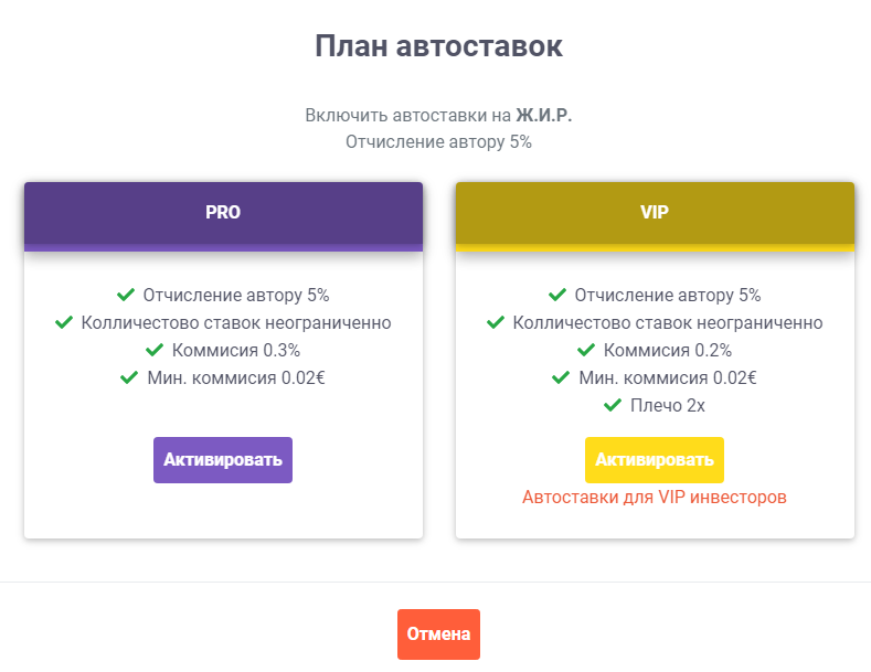 Комиссия сервису составляет 0,3% от каждой ставки. Данные отчисления идут на усовершенствование сообщества и добавления новых инструментов. Хотим обратить особое внимание, что мы не урезаем коэффициенты в Автобеттинге, ставки размещаются по самым выгодным коэффициентам. Поэтому за счет увеличенных коэффициентов комиссия 0.3% это минимальное предложение на рынке автобеттинга в мире. Минимальная комиссия с каждой ставки составляет 0.03 USD. Таким образом, инвесторам предлагается большой выбор лучших спортивных трейдеров рунета. Собирайте свой пул трейдеров и зарабатывайте на ставках, а за счет индивидуальной настройки ставок по каждому блогу вы сможете управлять финансовыми стратегиями.